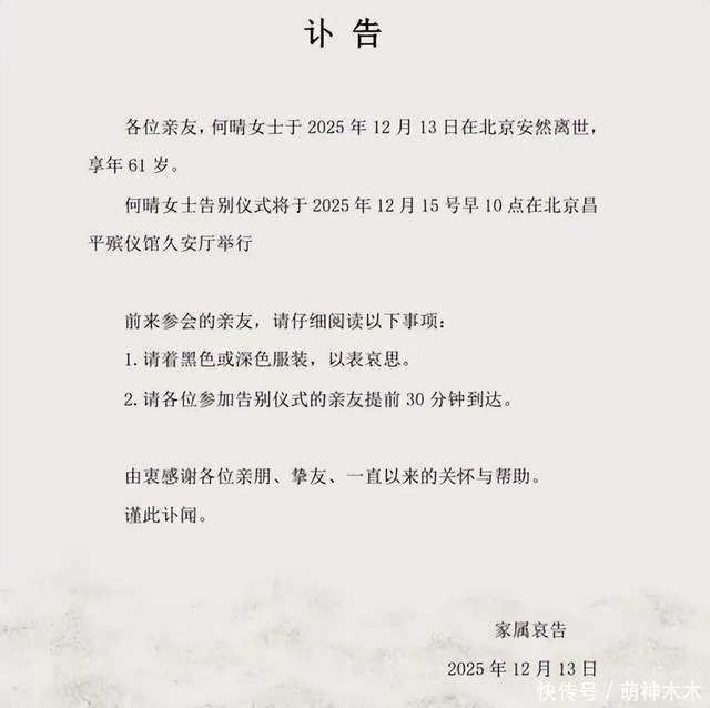 12月14日,何晴家属发布讣告,宣布她在北京安然离世,享年61岁,告别式将在大后天举行。